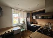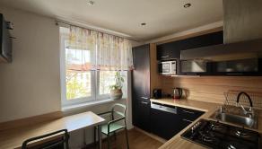 Byt má plastové okná, drevené podlahy a plne zariadenú kuchyňu.